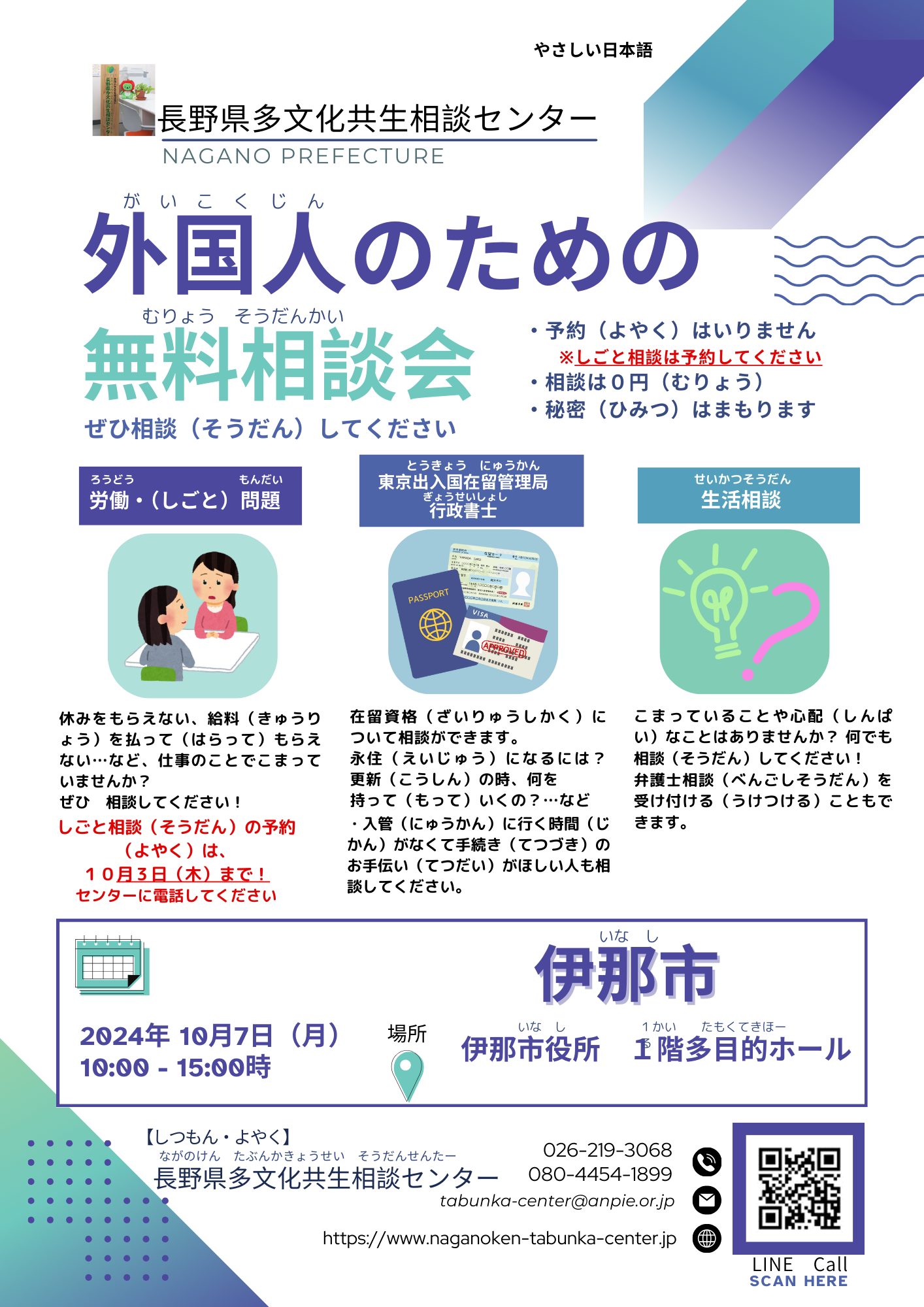 | お問い合わせ | 長野県多文化共生相談センター TEL : 026-219-3068 E-mail : tabunka-center@anpie.or.jp |