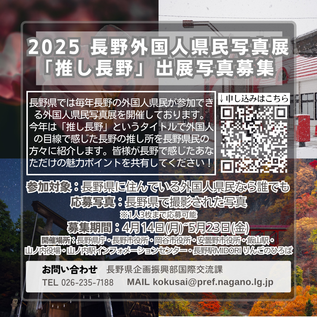 外国人(がいこくじん)の みなさんから、 長野県(ながのけん)の 写真(しゃしん)を 募集(ぼしゅう)しています。