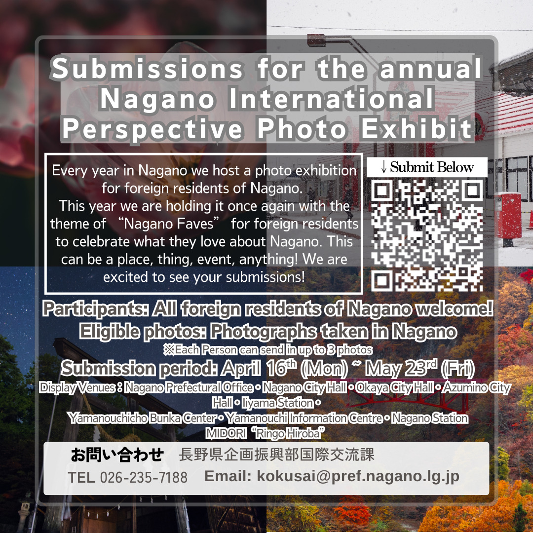 | 問合わせ(といあわせ) | 長野県 企画振興部 国際交流課(ながのけん きかく しんこうぶ こくさいこうりゅうか) TEL:026-235-7188 E-mail: kokusai@gmail.com |
